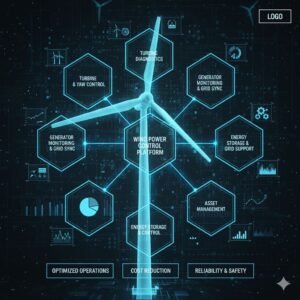 It Includes wind turbines, gearboxes, generators, blades, pitch/yaw systems, transformers, switchyards, SCADA controls, weather stations, and transmission lines. With IoT sensors, predictive analytics, and historian systems, operators can monitor performance, predict failures, and optimize energy yield. Dashboards and RPA tools enable efficient maintenance, reporting, and compliance, ensuring smarter, reliable, and future-ready wind energy operations with reduced downtime and improved sustainability.